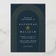 Formal wedding invitations featuring a lined metallic arch framing your ceremony details. Dark navy blue with gold foil.