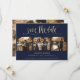 Elegant navy blue and gold wedding 4 photo save the date cards with a modern faux gold foil script title. Easily personalise this navy blue wedding save the date with your images and wedding details including a wedding website.