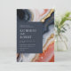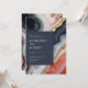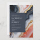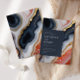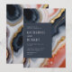 Contemporary wedding invitation featuring a dark blue square in which all your information is elegantly written on an abstract agate marble background. The agate details are in shades of orange and blue with gold accents. Check out our store for more items from this wedding collection.