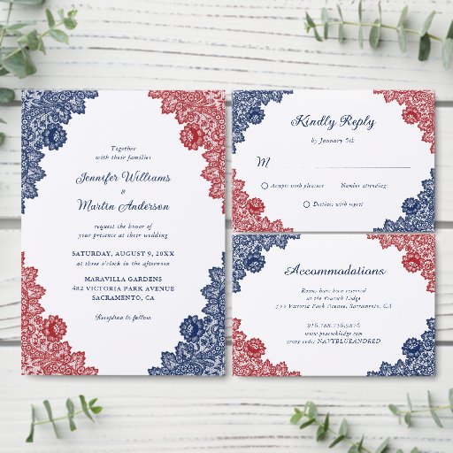 Rustic navy blue and red wedding insert card featuring elegant floral lace. Easily personalise this wedding enclosure card to provide your guests with important wedding details.