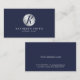 featuring navy blue script monogram in silver circle element with business information in silver professional font style on navy blue background.