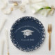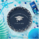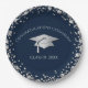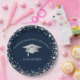 This modern design features a graduation hat and confetti in silver on a background of navy blue with white text.