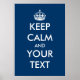 Navy blue and white Keep calm poster | Customise. Keep calm and carry on design spoof. Keep calm and dance on. Keep calm and rock on. Keep calm and shop on. Keepcalmandcarryon fun.