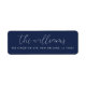 A fun twist on the classic yet modern return address label featuring script typography on top paired with a modern font on bottom in a minimalist layout. Finished in a sleek color scheme of white text on a navy blue background .