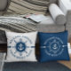 Elegant navy blue and white steering wheel with a rope and boat anchor, customisable white text. White dots and stripes design elements embellishments. Reversed colours on the backside of the pillow.