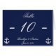 Navy blue and white wedding table number cards with customisable text