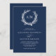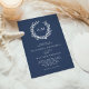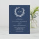 Perfect for beach and nautical themed weddings, a coral wreath frames the monograms of the bride and groom at the top of this elegant minimal navy blue coastal invitation with white text.