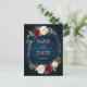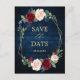 Dark navy blue burgundy floral geometric save the date postcard featuring elegant bouquet of navy blue, royal blue , white , blush, burgundy, marsala rose and sage green eucalyptus leaves and elegant gold glitter geometric neutral frame. Please contact me for any help in customisation or if you need any other product with this design.