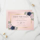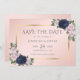 Navy blue and blush wedding save the date cards featuring a gold frame decorated with roses. Matching items available.