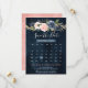 Beautiful floral boho wedding save the date calendar card features hand-painted watercolor floral graphics / roses in rich tones of navy blue and blush pink / peach and charming hand lettering style font.