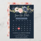 Beautiful floral boho wedding save the date calendar card features hand-painted watercolor floral graphics / roses in rich tones of navy blue and blush pink / peach and charming hand lettering style font.