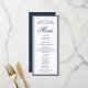 Elevate your wedding reception with this navy blue Elegant & Chic Botanical Crest Monogram Wedding Menu, designed to impress with its timeless sophistication. Featuring a sleek black and white colour palette, this menu showcases your custom monogram encased in a delicate botanical crest at the top, adding a personalised and refined touch to your table settings.