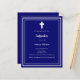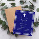A navy blue background, decorated with a white frame, and a white cross Personalise and add the name and details. White text.