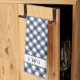 Farmhouse chic monogrammed kitchen towels feature a handpainted buffalo plaid pattern in navy blue and white, with a white band bearing your three initial monogram.