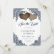 Complement your romantic navy blue rustic wedding party with these beautiful burlap and lace wedding save the date cards featuring two burlap hearts on a plain white background decorated with navy blue floral lace. Matching items available.