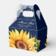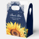 Custom navy blue wedding favour box featuring a burlap texture and sunflower flowers with string lights.