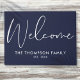 An elegant navy blue doormat featuring beautiful script calligraphy welcome and personalised with your family name and special date. Designed by Thisisnotme©