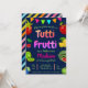 Amaze your guests with this colourful kids birthday party invite featuring assorted fruits and vibrant typography against a dark blue background. Simply add your event details on this easy-to-use template to make it a one-of-a-kind invitation. Flip the card over to reveal a colourful stripes pattern on the back of the card.