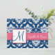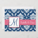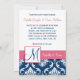 Stylish Wedding Invitations in rectangular format with Navy Blue and White Damask Pattern, Monogram, Names with Pink accent colours. Wedding Invitation Design by Elke Clarke ©2009. Graphics licensed for use. Customise with your monogram, names and wedding invitation information. Also, choose from a variety of fonts and beautiful papers to make your wedding invitations FABULOUS! Contact us for alterations in colours at luxuryweddinginvitations@gmail.com