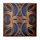 A sophisticated ceramic tile design featuring an intricate symmetrical pattern of flowing copper-colored curves and loops set against a deep navy blue background. The ornate swirls and elegant accents create a luxurious and timeless aesthetic.