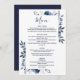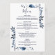 This elegant navy blue and white floral wedding menu can be personalised with your information in modern typography. Designed by Thisisnotme©