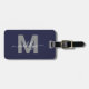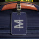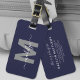 Create Your Own Stylish Elegant Custom World Traveller Navy Blue Initial Name Monogram Luggage Tag. This chic and stylish luggage tag adds a refined touch to any travel experience, making it the perfect accessory for the world traveller or anyone with a serious case of wanderlust. On the front, the design showcases a unique bold monogram featuring a vibrant navy blue initial set against a rich black background, paired with your name in a white script across it. The back includes the phrase “This bag belongs to” in the same script above your contact information in a clean, easy-to-read font, ensuring that your luggage is always identifiable. The name on the back is also in navy blue, but all colours can be changed. This monogrammed luggage tag is an ideal gift for a traveller, sorority sister, mum, or anyone who loves a sophisticated and personalised touch. Perfect for birthdays, holidays, or just because, it’s a stylish and functional addition to any travel essentials!