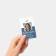 Custom navy Blue vertical badge featuring an employee photo and name, customisable text for employee ID number, role, title, location, or other key details. Add your company logo at the top. The back of the badge includes a custom text field for return information or other important details. This design allows for easy personalisation, ensuring each badge is unique and meets your company's specific needs.
