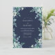 A deep navy blue backdrop sets a moody tone for this sophisticated design, featuring ethereal watercolor botanicals. Delicate teal and sage green wildflowers, alongside airy foliage and soft blossoms, create a natural forest aesthetic. This elegant palette captures a serene, painterly atmosphere for an evening or seasonal winter event.