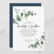 Eucalyptus Greenery foliage modern minimal garden party Wedding Invitations. Simple contemporary botanical design. Sage green, navy blue, black and white elegant modern colorway suits spring, summer fall, autumn and whiter wedding ceremonies.