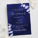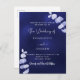 Navy blue background, decorated with eucalyptus stems, sprigs. The blue colour is uneven. Personalise and add your names and the details.