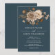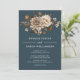 Elegant wedding invitations with boho-style florals in shades of ivory and deep brown on a dark blue background. Simplistic text layout with a pretty floral header.