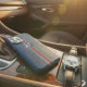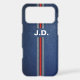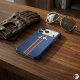 Elevate your tech with this sophisticated and sporty phone case. The design features a realistic, high-quality print of deep navy blue pebbled leather, accented by a classic vertical racing stripe in bold red and heather grey.