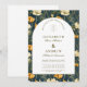 A rich and sophisticated floral design featuring deep navy tones accented with warm golden blooms, framed within a timeless arched layout. The contrast between the dark background and soft ivory center creates a striking, high-end aesthetic that feels both modern and classic.
