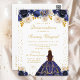 This elegant and glamourous Quinceañera birthday invitation features a beautiful princess with dark hair in a tiara and navy blue ball gown. The text combines handwritten script and modern sans serif fonts for a classy and sophisticated look. The floral arrangements and gold confetti create the perfect blend of rustic and chic.