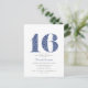 This eye-catching sweet 16 invitation postcard features a large bold navy blue 16 with a hand drawn floral pattern. Both the front and back of the postcard have plenty of room to include party details and/or a personal message.