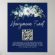Bold navy blue and white peony floral evening Honeymoon Fund poster with a QR code for a modern winter wedding. An elegant botanical spray of green leaves unfolds above trendy handwritten white script for a gorgeous modern event sign for your event.