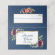 Decorated with watercolored bohemian, boho style flowers, roses in burgundy. Elegant navy blue and white background. Templates for names name and wedding date. The names is written with a modern and elegant hand lettered style script. Navy blue coloured letters. With a faux gold frame.