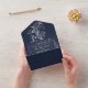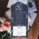 Invite guests to your upcoming wedding with a Navy Blue Flourish All in One Wedding Invite. Invite design features an elegant leafy flourish with matching coloured background with a perforated response card. Personalise with the groom and bride's names along with the wedding date and location. Additional wedding stationery available with this design as well.