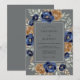 Deep navy blue and burnished gold roses create a striking contrast against a moody slate gray backdrop. This design features lush watercolor blooms paired with sage green and silvery foliage for a sophisticated seasonal aesthetic. The rich color palette evokes a formal atmosphere perfect for a late-season ceremony or cool-weather event. Prominent floral elements include open roses and delicate greenery.