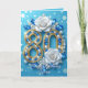 This elegant 80th birthday card design features the number "80" crafted in golden filigree, adorned with luminous pearls and radiant navy blue gems. Two pristine white roses, symbols of grace, rest among sparkling diamond-like accents and pearls. The light blue backdrop with a bokeh-like pattern creates a dreamy, celebratory feel. This is a jewel box of sophistication and glamour, perfect for a momentous 80th birthday. The text on the front and inside is fully customisable, allowing you to create a truly unique keepsake.