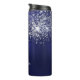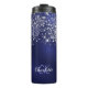 A navy blue background. The blue colour is uneven. Decorted with faux glitter drops. Personalise and add a name and monogram initials. The name is written with a modern hand lettered style script.