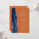 The left-hand edge of this elegant modern wedding invitation features a navy blue watercolor agate border trimmed with faux gold glitter. The customisable text combines gold-coloured handwriting, copperplate and italic fonts on a burnt orange background. The reverse side provides space for wedding details on a solid burnt orange background, along with a QR code guests can scan to visit your website and RSVP, which saves the cost of printing and mailing separate RSVP cards.