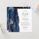 The left-hand side of this elegant modern square wedding invitation features a navy blue watercolor agate border trimmed with faux gold glitter. The customisable text combines charcoal grey handwriting, copperplate and italic fonts on a white background. The reverse side features a matching navy blue and gold agate design.