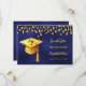 On front: A navy blue background, golden text. The blue colour is uneven. Templates for a name and date. The name and the text: Save the Date are written with a modern hand lettered style script. With a faux gold cap, tassel topper.