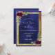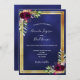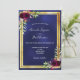 A trendy, modern wedding invitation. A dark blue, navy blue background. The blue colour is uneven. With a faux gold frame and burgundy watercolored florals, flowers with greenery. Templates for your names and ceremony information. The names are written with a modern hand lettered style script.