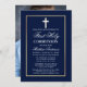Elegant Navy Blue First Holy Communion Invitation with Cross. Gold Frame. Photo Back.