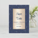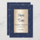 This elegant navy blue and gold glitter confetti border luxury Wedding Save the Date Invitation is inspired by the simple and elegant was but with subtle hints of modern influence. It features a glam champagne gold square centre on a sparkly navy blue and gold background. This classic and luxury design will be a big hit with all your guests. All designs are printed.