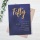A modern, stylish invitation for a 50th birthday party for both him and her. The blue colour is uneven. Navy blue background and the word Fifty written with large faux gold letters. Personalise and add a name and party details. White text.