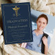 This classic, elegant graduation party invitation design features a gold-coloured caduceus flanked by two letters (for example, RN for Registered Nurse) on a navy blue background. Personalise the text with the graduate's name, school and year, along with the party details. A thin, gold-coloured rectangular border frames the design. Add a vertical photo of the graduate on the back of the card.