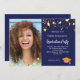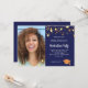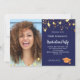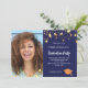 Add your own vertical size photo of the graduate. A chic navy blue background colour, decorated with faux gold stars. Personalise and add a name and party details. Golden letters.